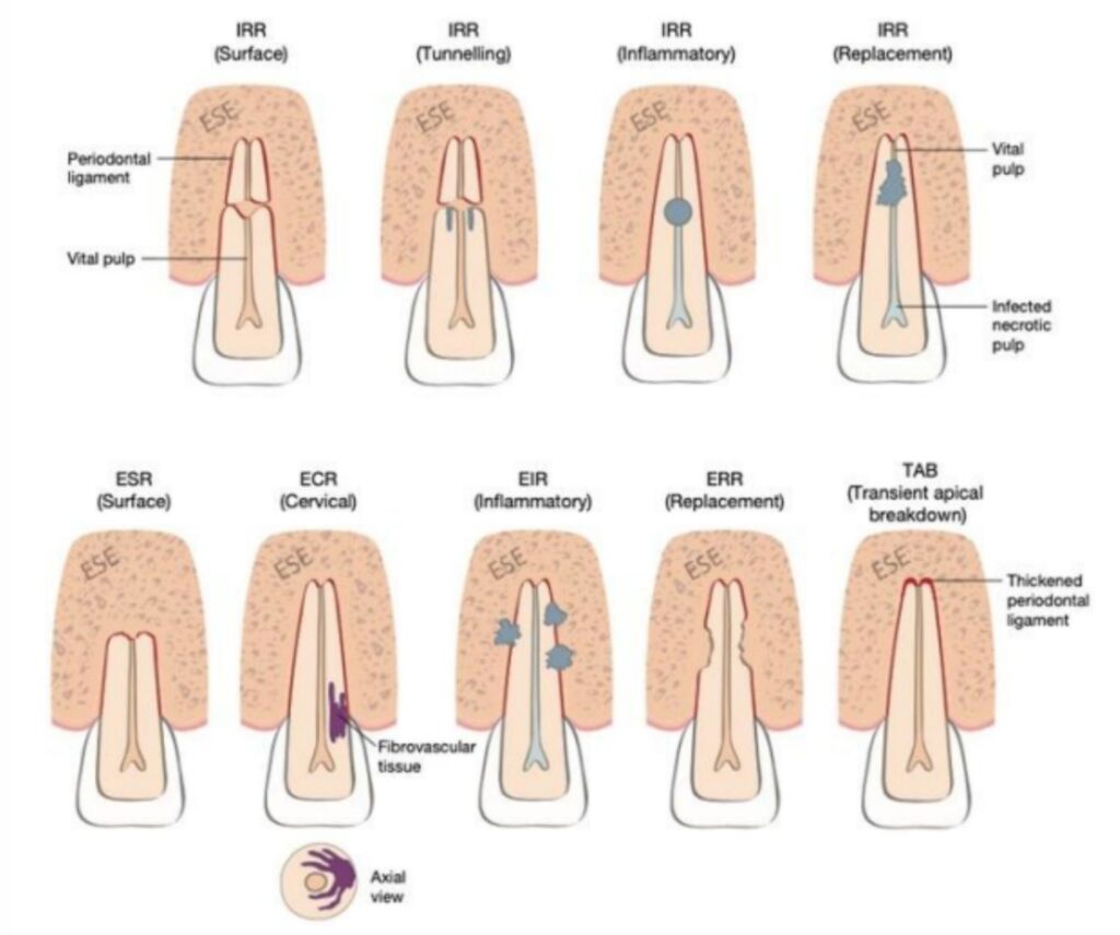 Then you got external resorption—that’s the real horror movie stuff. Comes from the outside, like a SWAT team takin’ the wall down. Can be: